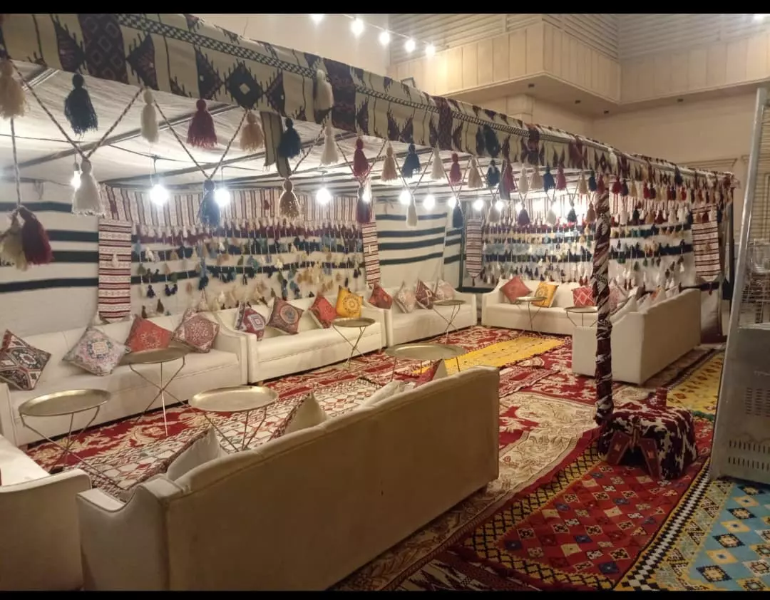 الخيم التي تنصب في أي مكان عادي وتستطيع أن تخطف عقول الضيوف من جمال الديكورات الذي يجمع بين أحدث التصميمات الهندسية.