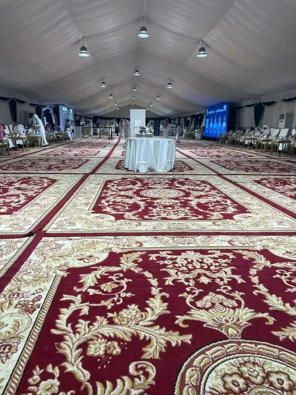 على حسب عدد الحاضرين يتم تجهيز الخيام بشكل أنيق وتجهيز أرضيات الخيام بسجاد نظيف ولائق، وكذلك تركيب الستائر المبهجة التي تعطي لمسات سحرية للخيام، تركيب الإضاءات وأنظمة الصوت.